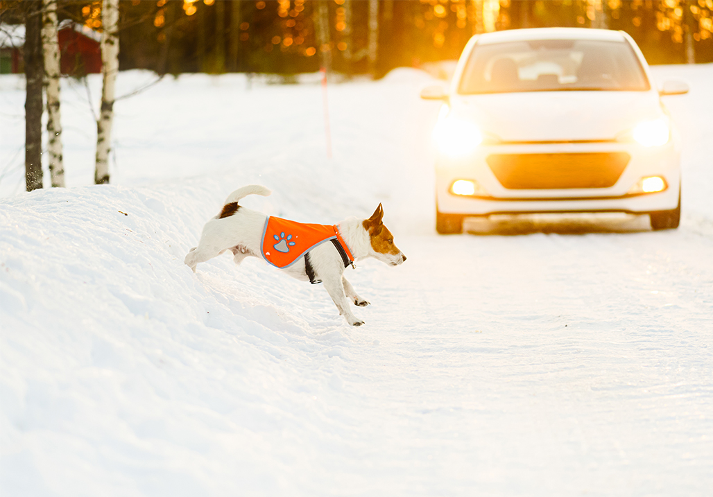 Even the middle of the day can bring whiteout conditions. Be sure to throw on a reflective vest and an LED collar for your pup. This will help you stay visible to all drivers, fellow winter walkers, and other people/pets in the area.